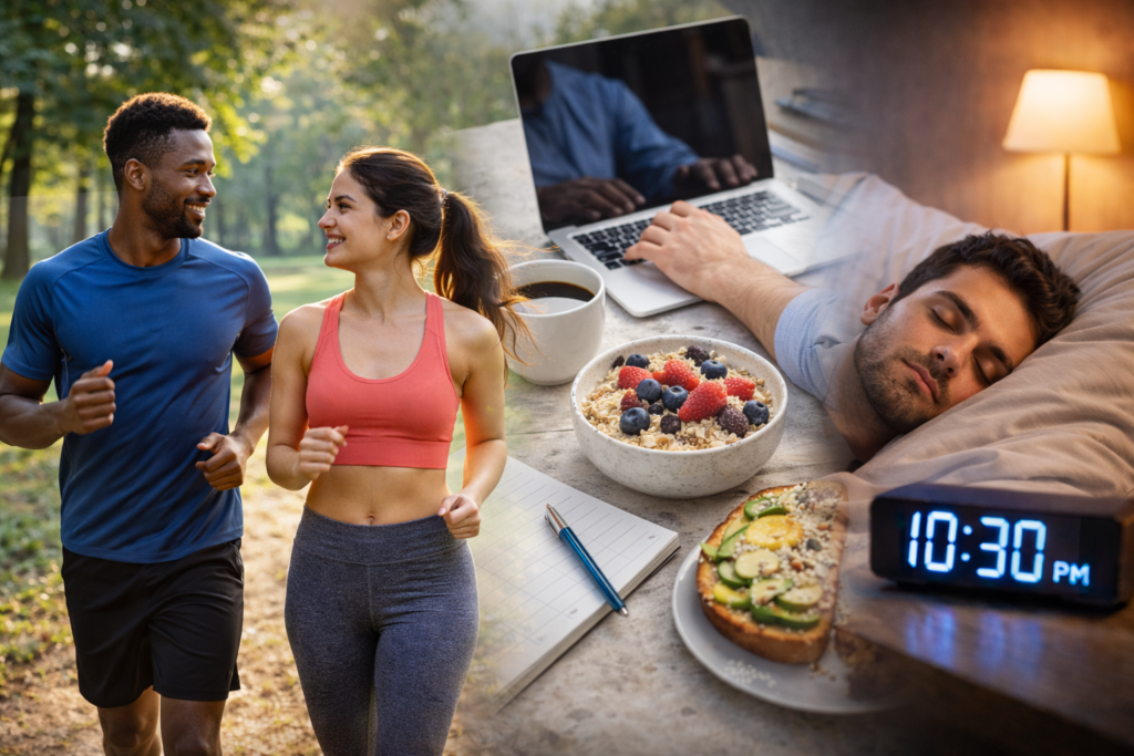 Habit number three is getting your body moving daily. There is no requirement to sign up at a gym or perform heavy workouts. Just walking, stretching, yoga, or home exercises for 1530 minutes will suffice. The daily movement revitalizes blood circulation, strengthens muscles, and releases happy hormones that alleviate anxiety and depression. Gradually, you will experience better sleep, better posture, and increased confidence.